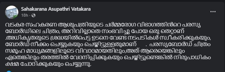 വടകര സഹകരണ ആശുപത്രിയിൽ ചർമരോഗ വിഭാഗത്തിന്റെ പരസ്യത്തിൽ മോർഗൻ ഫ്രീമാൻ;അറിവില്ലാതെ സംഭവിച്ച പിഴവ് ക്ഷമചോദിച്ച് പരസ്യം പിന്‍വലിച്ചു