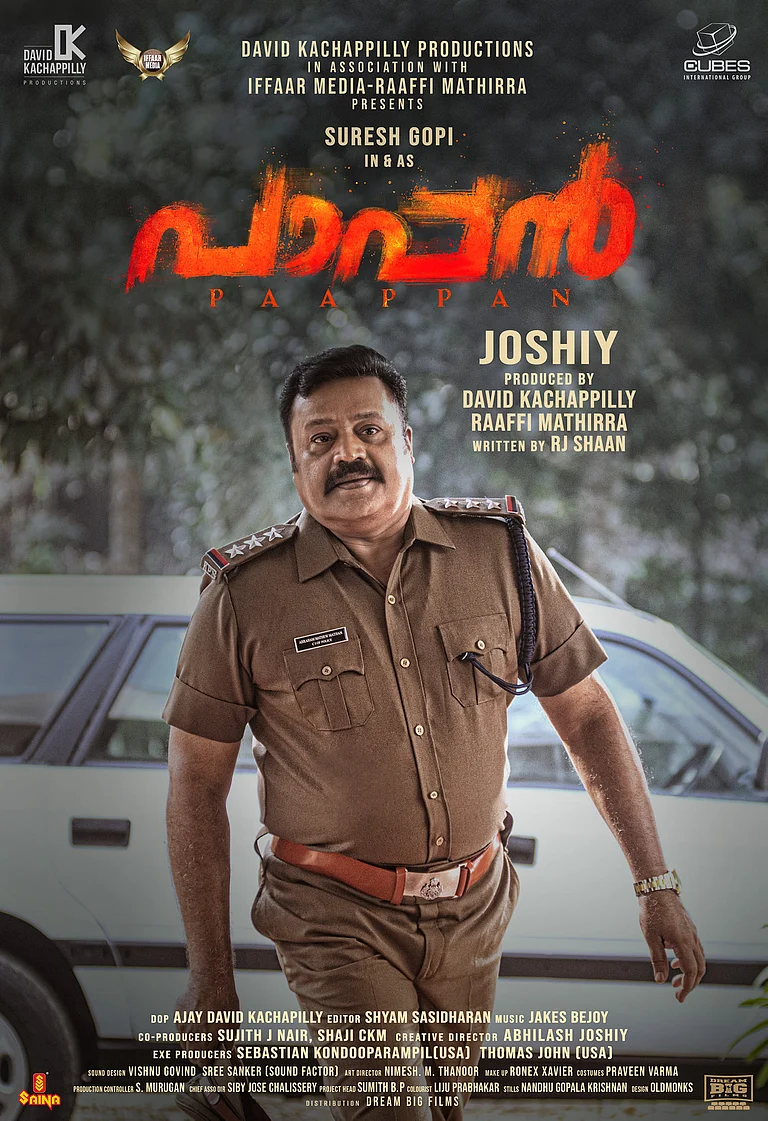 നീണ്ട നാളത്തെ ഇടവേളക്ക് ശേഷം സുരേഷ് ഗോപി വീണ്ടും പൊലീസ് വേഷത്തിലെത്തുന്ന പാപ്പന് എന്ന ചിത്രത്തേയും ഏറെ പ്രതീക്ഷയോടെയാണ് ആരാധകര് കാണുന്നത്.രണ്ട് ഗെറ്റപ്പുകളാണ് സുരേഷ് ഗോപിക്ക് ചിത്രത്തിലുള്ളത്. പൊലീസ് ഗെറ്റപ്പിലുള്ള സുരേഷ് ഗോപിയുടെ ചിത്രം അണിയറ പ്രവര്ത്തകര് റിലീസ് ചെയ്തു.മാത്യൂസ് പാപ്പന് ഐ.പി.എസായി പൊലീസ് വേഷത്തിലാണ് പോസ്റ്ററില് സുരേഷ് ഗോപി എത്തിയിരിക്കുന്നത്.