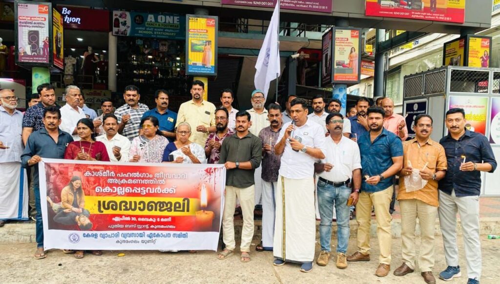 കുന്ദമംഗലം : കേരള വ്യാപാരി വ്യവസായി ഏകോപന സമിതി കുന്ദമംഗലം യൂനിറ്റ് കമ്മറ്റിയുടെ നേതൃത്വത്തിൽ കാശ്മീർ പഹൽഗാം തീവ്രവാദി അക്രമണത്തിൽ കൊല്ലപ്പെട്ടവർക്ക് മെഴുകുതിരി കത്തിച്ച് ശ്രദ്ധാഞ്ജലി അർപ്പിച്ചു. കെ.വി വി ഇ എസ് ജില്ലാ വൈസ് പ്രസിഡണ്ട് എം ബാബുമോൻ ഉദ്ഘാടനം ചെയ്തു.പി ജയശങ്കർ അധ്യക്ഷത വഹിച്ചു. എൻ വിനോദ് കുമാർ, സുനിൽ കണ്ണോറ , കെ സജീവ്, എം പി മൂസ, ടി സി സുമോദ്, ടി വി ഹാരിസ്, എം കെ റഫീഖ്, ടി ജിനിലേഷ്, ഒ പി ഭാസ്ക്കരൻ, കെ പി അബ്ദുൽ നാസർ, ആലിസ് നെൽസൺ , കെ കെ മഹിത, കെ യൂനുസ്, വി കെ ഷിജില, ജസീല, കെ കമല നേത്യത്വം നൽകി
