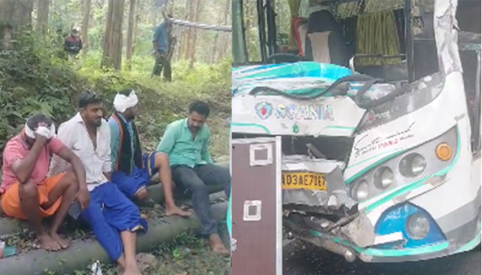 പുലര്‍ച്ചെ അഞ്ചുമണിയോടെയായിരുന്നു സംഭവം. ആക്രമണത്തില്‍ ബസിന്റെ മുന്‍ഭാഗം തകര്‍ന്നു. കുട്ടികള്‍ ഉള്‍പ്പെടെയുള്ളവര്‍ക്ക് പരുക്കേറ്റു.ആരുടേയും പരുക്ക് ഗുരുതരമല്ല.