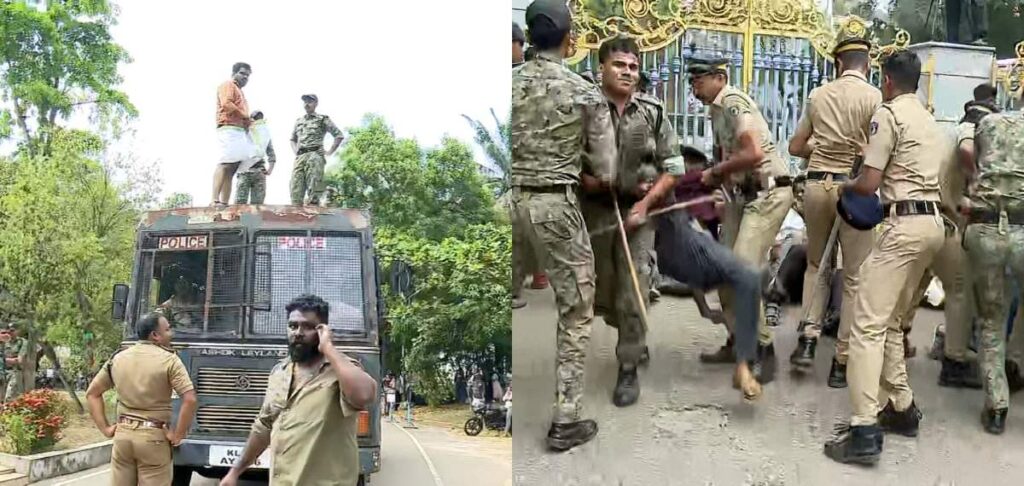 കേരള സർവകലാശാലയിൽ വൈസ് ചാൻസലർ മോഹനൻ കുന്നുമ്മലിനെതിരെ എസ് എഫ് ഐ പ്രതിഷേധം. പ്രതിഷേധക്കാർ വിസിയെ മോഹൻ ഭഗവതിനോട് ഉപമിച്ച് ബാനർ ഉയർത്തി. വിസിയെ കാണാനില്ലെന്നും എസ് എഫ് ഐ പ്രവർത്തകർ പരിഹസിച്ചു.സർവകലാശാല ആസ്ഥാനത്തിന് മുന്നിലാണ് ബാനർ കെട്ടി പ്രതിഷേധിച്ചത്. പ്രതിഷേധിച്ച എസ് എഫ് ഐ സംസ്ഥാന സെക്രട്ടറി പി.എം ആർഷോ അടക്കമുള്ളവരെ പൊലീസ് അറസ്റ്റ് ചെയ്ത് നീക്കി. എസ് എസ് എഫ് ഐ പ്രവർത്തകരുമായി പോയ പൊലീസ് വാഹനം പ്രതിഷേധക്കാർ തടഞ്ഞു.ക്രമസമാധാന പ്രശ്നത്തിലേക്ക് പോകുകയാണെന്ന് കാണിച്ച് സർവകലാശാല കത്തയച്ചിരുന്നതായി പൊലീസ് അറിയിച്ചു. യൂണിവേഴ്സിറ്റിക്ക് മുന്നിലുള്ള സമരപ്പന്തൽ പൊലീസ് പൊളിച്ചുനീക്കി.