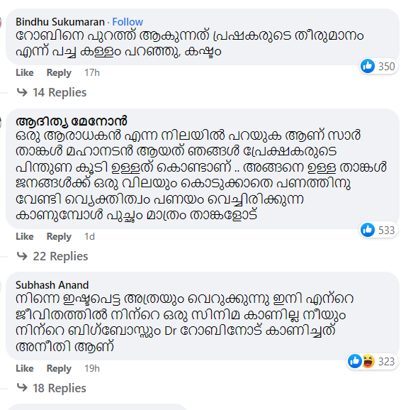 ‘നാണമില്ലാത്ത നട്ടെല്ലില്ലാത്ത അവതാരാകന്’, ‘സ്വന്തമായിട്ട് ഒരു അഭിപ്രയം പോലും ഇല്ലാത്ത ഒരു കംപ്ലിക്ട് ആക്ടര്’, ‘ഡോക്ടര് റോബിനെ തിരിച്ചെടുത്തില്ലേല് ഏഷ്യാനെറ്റ് ഞങ്ങള് പൂട്ടിക്കും’, ‘Barroz ഉം കോപ്പും കൊണ്ട് ഇങ്ങോട്ടു വാ…ഞങ്ങള്ക് വില ഉണ്ടോ എന്ന് കാണിച്ചു തരാം ഇനി മുതല്’, ഇത്തരത്തിലുള്ള കമന്റുകള് കൊണ്ടാണ് താരത്തിന്റെ കമന്റ്ബോക്സ് നിറയുന്നത്.