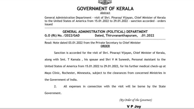 സംസ്ഥാന മുഖ്യമന്ത്രി പിണറായി വിജയൻ വിദഗ്ധ ചികിത്സക്കായി ഈ മാസം 15 ന് അമേരിക്കയിലേക്ക്. ചികിത്സക്ക് വേണ്ടി രണ്ടാഴ്ച മുഖ്യമന്ത്രി അമേരിക്കയിൽ തുടരും. ഇത് സംബന്ധിച്ച സർക്കാർ ഉത്തരവ് പുറത്തിറങ്ങി. മയോക്ലിനിക്കിലെ തുടർ ചികിത്സ, പരിശോധന എന്നിവയ്ക്കാണ് അമേരിക്കയിലേക്ക് പോകുന്നതെന്നും ഭാര്യ കമലയും ഒരു പിഎയും അദ്ദേഹതോടൊപ്പം ഉണ്ടാകുമെന്ന് മുഖ്യമന്ത്രിയുടെ ഓഫീസ് വിശദീകരിച്ചു.