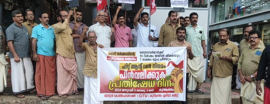 കേന്ദ്ര സർക്കാർ പാർലമെൻ്റിൽ കൊണ്ടുവന്ന് പാസാക്കിയ ഹിറ്റ് ആൻ്റ് റൺ നിയമത്തിനെതിരെ പ്രതിഷേധം. തൊഴിലാളികൾക്ക് 10 വർഷം തടവും7 ലക്ഷം രൂപ പിഴയും നൽകുന്ന ഹിറ്റ് ആൻ്റ് റൺ കിരാത നിയമത്തിനെതിരെ മോട്ടോർ കോൺഫെഡറേഷൻ സി ഐ ടി യു കുന്ദമംഗലം ഏരിയാ കമ്മറ്റിയുടെ നേതൃത്വത്തിൽ കുന്ദമംഗലം ബസ്റ്റാന്റ് കേന്ദ്രീകരിച്ച് പ്രതിഷേധ ദിനം ആചരിച്ചു . ലൈറ്റ് മോട്ടോർ ജില്ലാ സിക്രട്ടറി പി ആരിഷ് ഉദ്ഘാടനം ചെയ്തു. ഏരിയാ പ്രസിഡണ്ട് എം എം സുധീഷ് കുമാർ അദ്ധ്യക്ഷത വഹിച്ചു. ഗുഡ്സ് ട്രാൻസ്പോർട്ട് വർക്കേഴ്സ് യൂണിയൻ കുന്ദമംഗലം ഏരിയാ സെക്രട്ടറി സി. പ്രമോദ് സ്വാഗതം പറഞ്ഞു പി. പവിത്രൻ,ജി ടി സുബ്രഹ്മണ്യൻ, ബാവ പുതുക്കുടി സുന്ദരേശൻ തുടങ്ങിയവർ സംസാരിച്ചു. ഏരിയാ ട്രഷറർ മധു മാവൂർനന്ദി രേഖപ്പെടുത്തി.