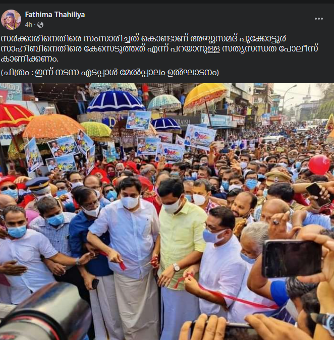 എടപ്പാള്‍ മേല്‍പ്പാലം ഉദ്ഘാടനത്തിനെതിരെ വ്യാപക വിമര്‍ശനം.ഒമിക്രോണ്‍ വ്യാപനം വര്‍ധിക്കുന്ന സാചര്യത്തില്‍ നിയന്ത്രണങ്ങള്‍ കര്‍ശനമാക്കാന്‍ സര്‍ക്കാര്‍ നിര്‍ദേശം നിലനില്‍ക്കെയാണ് ആയിരങ്ങളെ പങ്കെടുപ്പിച്ച് നടന്ന സര്‍ക്കാരിന്റെ ‘ഉദ്ഘാടന മാമാങ്ക’മെന്നാണ് വിമര്‍ശനമുയരുന്നത്.എം.എസ്.എഫ് മുന്‍ ദേശീയ വൈസ് പ്രസിഡന്റ് അഡ്വക്കറ്റ് ഫാത്തിമ തെഹ്‌ലിയയും ഫേസ്ബുക്ക് പോസ്റ്റിലൂടെ ഉദ്ഘാടനത്തിനെതിരെ വിമര്‍ശനവുമായി രംഗത്തെത്തിയിട്ടുണ്ട്.