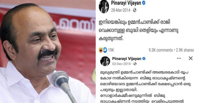 ക്രിമിനല് കേസ് പ്രതിയായ ബിജു രാധാകൃഷ്ണന് അഞ്ചരകോടി രൂപ കോഴ നല്കിയെന്ന മൊഴിയോടെ അന്നത്തെ മുഖ്യമന്ത്രിയായിരുന്ന ഉമ്മന് ചാണ്ടിക്ക് രക്ഷപ്പെടാന് ഒരു പഴുതും ഇല്ലാതായെന്ന് 2015 ഡിസംബര് രണ്ടിന് ഫേസ്ബുക്കില് പോസ്റ്റിട്ട സി.പി.ഐ.എം സംസ്ഥാന സെക്രട്ടറിയാണ് ഇന്ന് മുഖ്യമന്ത്രി കസേരയില് ഇരിക്കുന്നത്. കേസില് ഉള്പ്പെട്ട വനിതയെ വിളിച്ചുവരുത്തി പരാതി എഴുതിവാങ്ങി ഉമ്മന് ചാണ്ടിക്കെതിരെ സി.ബി.ഐ അന്വേഷണത്തിന് ശിപാര്ശ ചെയ്ത മുഖ്യമന്ത്രിയാണ് പിണറായി വിജയന്.