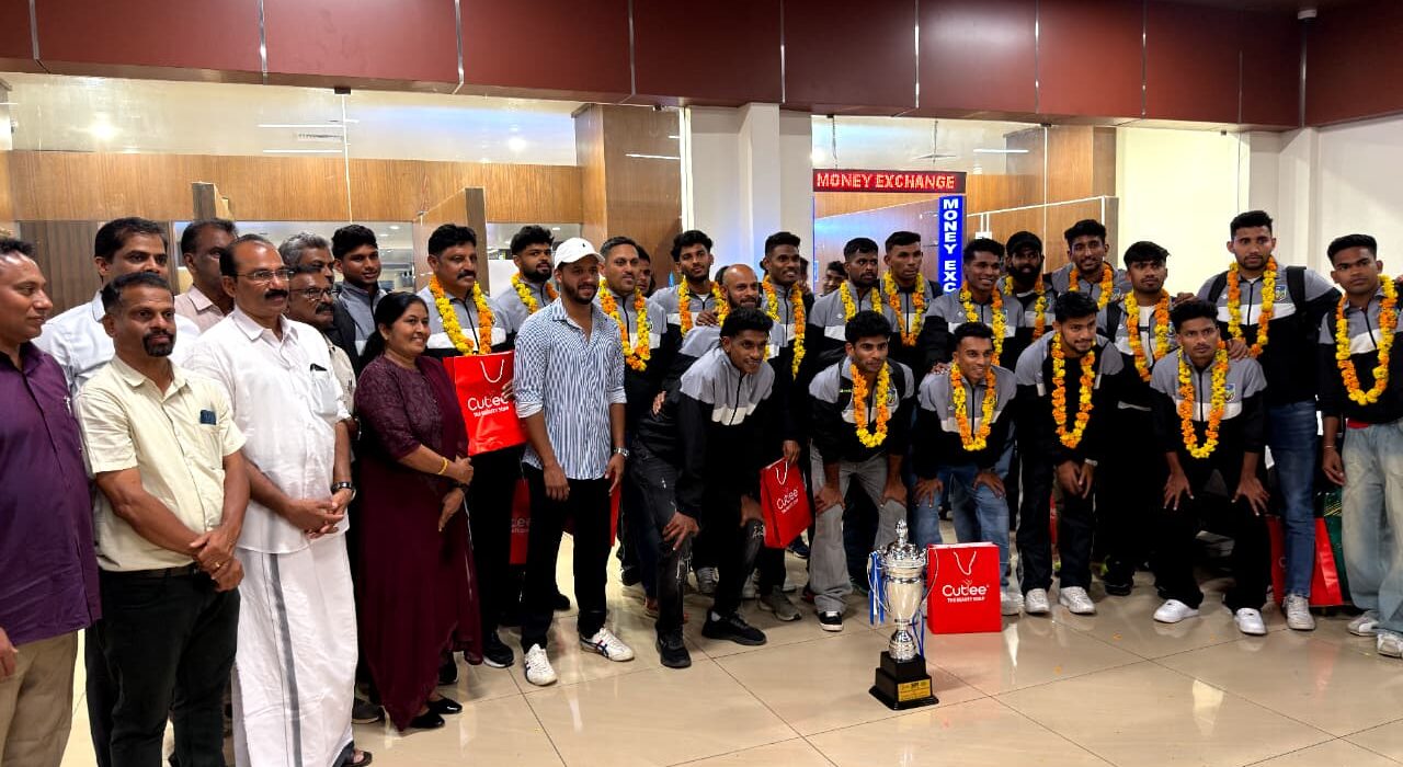 KFA സെക്രട്ടറി ഷാജി സി കുര്യൻ, മുൻ AIFF സെക്രട്ടറി പി അനിൽകുമാർ, എറണാകുളം ജില്ല ഫുട്ബോൾ അസോസിയേഷൻ സെക്രട്ടറി വിജു ചുളയ്ക്കൽ, കേരള ടീമിന്റെ സ്പോൺസറായ ക്യൂട്ടി ബ്യൂട്ടി സോപ്പിന്റെ എക്സിക്യൂട്ടീവ് ഡയറക്ടർ ഇസ്മായിൽ ഖാലിദ്, ഡി എഫ് എ ഭാരവാഹികളായ നൗഷാദ്, ജോസ് ലോറൻസ്, ജോൺ കളരിക്കൽ എന്നിവർ ചേർന്ന് സ്വീകരിച്ചു.