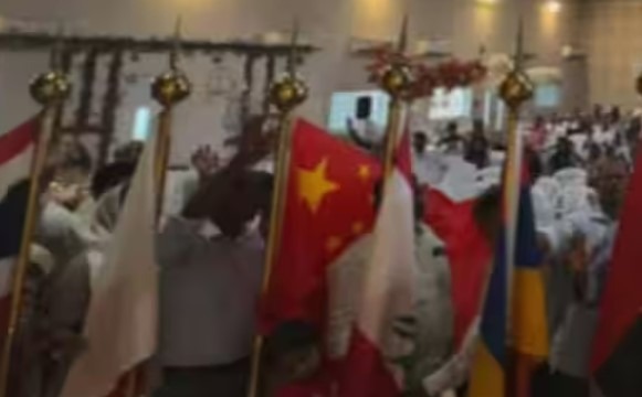 എന്നാല്‍ ഒന്നരവര്‍ഷം മുമ്പ് ചൈനയില്‍ നിന്നാണ്20 രാജ്യങ്ങളുടെ പതാക വാങ്ങിയതെന്നാണ്ഓഡിറ്റോറിയം ഉടമ പൊലീസിനോട് പറഞ്ഞത്. വിവിധ രാജ്യങ്ങള്‍ക്കായുള്ള പ്രാര്‍ഥനയില്‍ ഈ പതാകകള്‍ ഉപയോഗിക്കാറുണ്ടെന്നും അദ്ദേഹം മൊഴി നല്‍കിയിട്ടുണ്ട്.