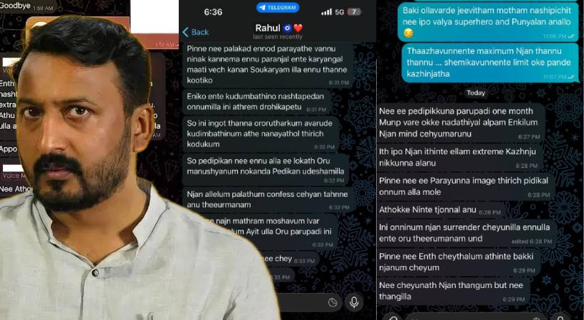 നീ എന്ത് ചെയ്താലും അതിന്റെ ബാക്കി ഞാൻ ചെയ്യുമെന്ന് രാഹുൽ യുവതിയെ ഭീഷണിപ്പെടുത്തുന്നതും ചാറ്റിലുണ്ട്. നീ ചെയ്യുന്നത് ഞാൻ താങ്ങും ബട്ട് നീ താങ്ങില്ല എന്നും രാഹുൽ വെല്ലുവിളിക്കുന്നുണ്ട്. “എനിക്ക് ഒന്നും നഷ്ടപ്പെടാൻ ഇല്ല. ആകെ ഇപ്പോ ഇല്ലാത്തതും നീ ഇപ്പോ എക്സ്ട്രാ ചെയ്യും എന്ന് പറയുന്നതും കേസ് കൊടുക്കൽ ആണ്. ഈ കേസ് കോർട്ടിൽ വരുമ്പോ ഉള്ള അവസ്ഥ നിനക്ക് അറിയാമല്ലോ. അതിൽ പ്രത്യേകിച്ച് ഒന്നുമില്ല. അപ്പോ നീ അതൊക്കെ കഴിഞ്ഞിട്ട് വാ” എന്ന് രാഹുൽ മാങ്കൂട്ടത്തിൽ യുതവതിയോട് പറയുന്നുണ്ട്. ബാക്കി ഉള്ളവരുടെ ജീവിതം നശിപ്പിച്ചിട്ട് ഇപ്പോൾ വലിയ സൂപ്പർഹാറോ ആയല്ലോ എന്നും താഴാവുന്നതിന്റെ മാക്സിമം താഴ്ന്നു എന്നും ക്ഷമിക്കുന്നതിന്റെ പരിധി പണ്ടേ കഴിഞ്ഞെന്നും രാഹുലിനോട് യുവതി പറയുന്നുണ്ട്.