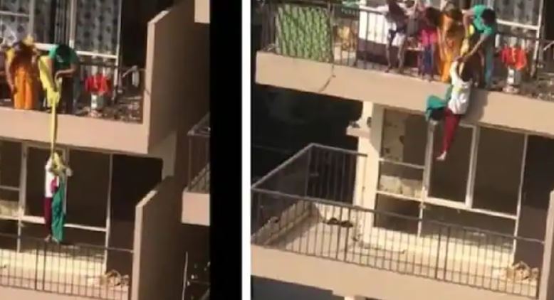 പത്താമത്തെ നിലയിലാണ് മകനും അമ്മയും താമസം. അവരുടെ ബാൽക്കണിയിൽ വിരിച്ചിരുന്ന സാരികളിൽ ഒന്ന് ഒൻപതാമത്തെ നിലയിലെ ബാൽക്കണിയിലേയ്ക്ക് വീഴുകയും. ആരും താമസമില്ലാതെ പൂട്ടിയിട്ടിരിക്കയായിരുന്ന ഫ്ലാറ്റിൽ വീണ സാരി എടുക്കാൻ വേറെ വഴിയൊന്നും കാണാതെ, അവർ സ്വന്തം മകനെ ഒരു ബെഡ്ഷീറ്റിൽ കെട്ടി ഇത്രയും ഉയരത്തിൽ നിന്ന് താഴേക്കിറക്കി. അമ്മയും മറ്റ് കുടുംബാംഗങ്ങളും ബെഡ്ഷീറ്റ് ഒരു കയർ പോലെ ചുരുട്ടി കുഞ്ഞിന്റെ ശരീരത്തിൽ ചുറ്റിക്കെട്ടി. തുടർന്ന് അമ്മ മകനെ താഴത്തെ ഒഴിഞ്ഞു കിടക്കുന്ന ബാൽക്കണിയിലേയ്ക്ക് ഇറക്കി. സാരി എടുത്ത ശേഷം തിരികെ അമ്മയും കൂടെയുള്ളവരും കുഞ്ഞിനെ മുകളിലേയ്ക്ക് വലിച്ച് കയറ്റുന്നതും വീഡിയോയിൽ കാണാം.മുകളിലേക്ക് വലിച്ചു കയറ്റുമ്പോള് കുട്ടിയുടെ കയ്യില് പച്ചനിറത്തിലുള്ള വസ്ത്രവും കാണാം. സെക്ടര് 82-ലെ സൊസൈറ്റിയിലെ ഫ്ളാറ്റിലാണ് സംഭവം നടന്നത്.
