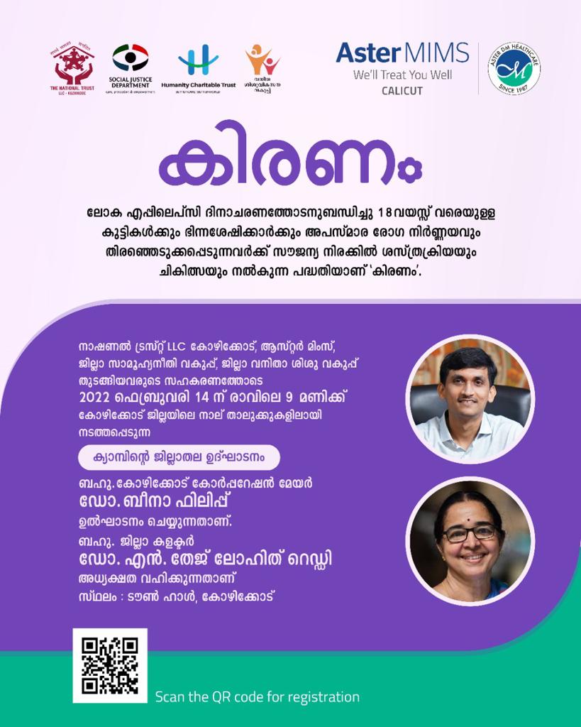 നാഷണല് ട്രസ്റ്റ് LLC കോഴിക്കോട്, ആസ്റ്റര് മിംസ്, ജില്ലാ സാമൂഹ്യനീതി വകുപ്പ്, ജില്ലാ വനിതാ-ശിശു വികസന വകുപ്പ്, ഹ്യുമാനിറ്റി ചാരിറ്റബിള് ട്രസ്റ്റ് തുടങ്ങിയവരുടെ സഹകരണത്തോടെ നാല് താലുക്കുകളിലും മെഡിക്കല് ക്യാമ്പ് സംഘടിപ്പിക്കും. ഫെബ്രുവരി 14 രാവിലെ 9 മണിക്ക് ക്യാമ്പിന്റെ ജില്ലാതല ഉദ്ഘാടനം കോഴിക്കോട് ടൗണ്ഹാളില് മേയര് ബീനാ ഫിലിപ്പ് നിര്വഹിക്കും. കോഴിക്കോട് താലൂക്കിലെ ക്യാമ്പും അന്നേദിവസം ടൗണ്ഹാളില് സംഘടിപ്പിക്കും.