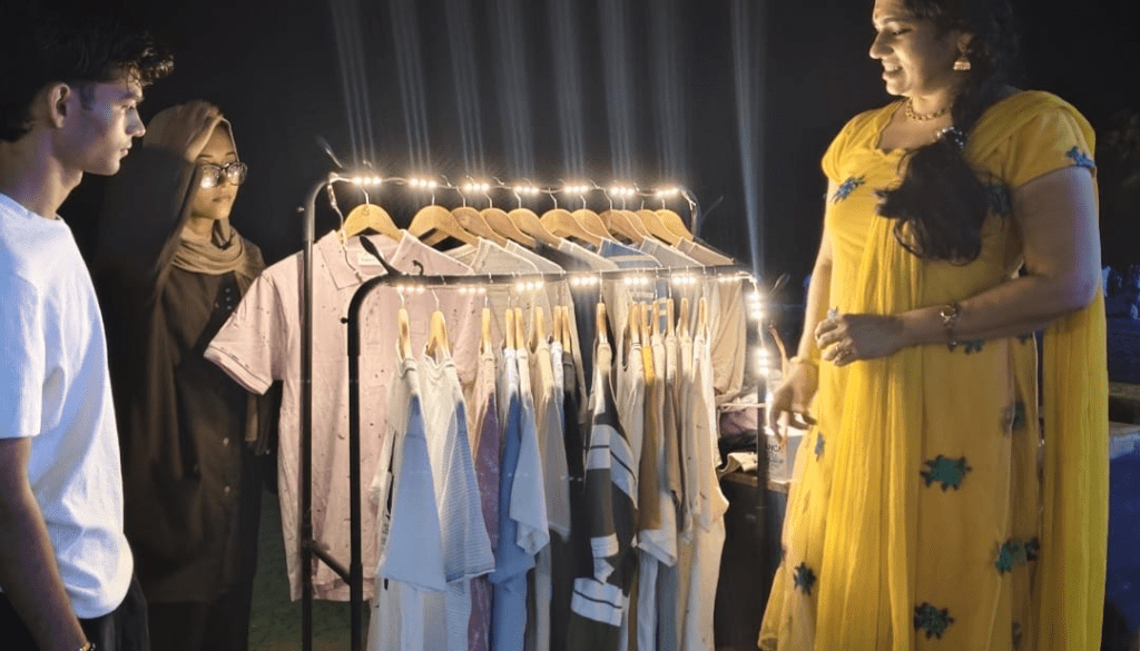 ഉത്തരപ്രദേശ് സ്വദേശിയായ സിസാനും മലപ്പുറം സ്വദേശിയായ നജീബയും ചേർന്ന് കടപ്പുറത്ത് ഒരുക്കിയ ചെറിയ സ്റ്റാൾ, സന്ധ്യാസമയത്ത് എത്തുന്നവരുടെ ശ്രദ്ധ പിടിച്ചുപറ്റുന്നതാണ്. ലൈറ്റുകൾക്കിടയിൽ ഹാങ്കറുകളിൽ തൂങ്ങിയിരിക്കുന്ന ടീഷർട്ടുകളും ബനിയനുകളും കടലിന്റെ പശ്ചാത്തലത്തിൽ ഒരു പ്രത്യേക സൗന്ദര്യം സൃഷ്ടിക്കുന്നു. സൗഹൃദപരമായ ഇടപെടലും മനോഹരമായ അവതരണവും കൊണ്ട് നിരവധി പേർ ഇവിടേക്ക് എത്തുന്നു.