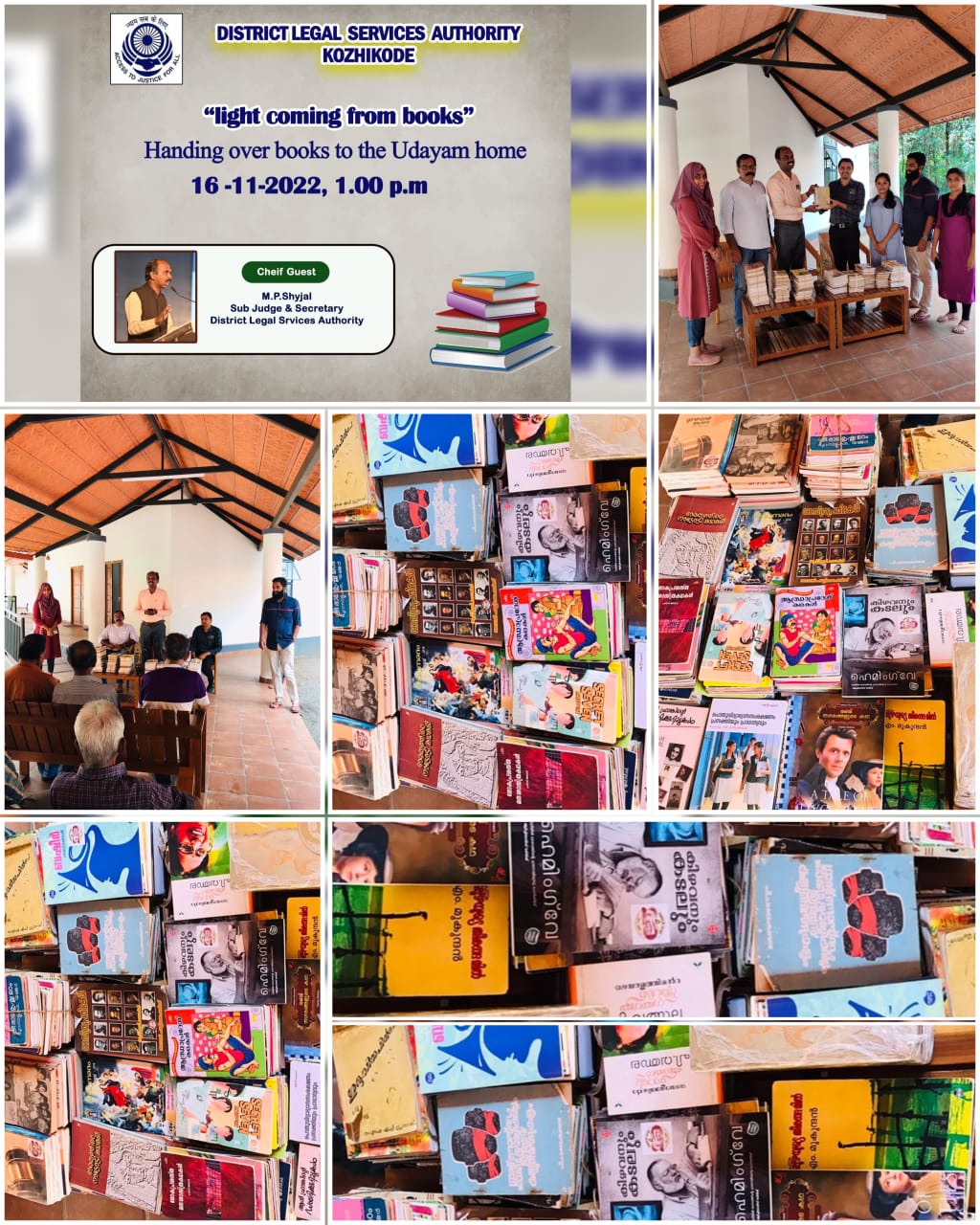തെരുവിൽ നിരാലംബരായി കഴിയുന്നവരെ പാർപ്പിക്കുന്ന ഉദയം ഹോമിൽ ജില്ലാ നിയമസേവന അതോറിറ്റി പുസ്തകങ്ങൾ നൽകി. കഴിഞ്ഞദിവസം ഉന്നത വിദ്യാഭ്യാസ സാമൂഹ്യ ക്ഷേമ വകുപ്പ് മന്ത്രി ബിന്ദു ഉദയം ഹോം സന്ദർശിച്ചപ്പോൾ അന്തേവാസി വായനക്കായി ഇനിയും പുസ്തകങ്ങൾ ആവശ്യമുണ്ടെന്ന് മന്ത്രിയോട് പറഞ്ഞിരുന്നു. അതിനുഷേശം മന്ത്രി തിരുവനന്തപുരത്ത് നടന്ന സെമിനാറിൽ കേരള സ്റ്റേറ്റ് ലീഗൽ സർവീസസ് അതോറിറ്റി മെമ്പർ സെക്രട്ടറിയുടെയും ജില്ലാ നിയമസേവന അതോറിറ്റി സെക്രട്ടറിമാരുടെയും സാന്നിധ്യത്തിൽ ഈ അനുഭവം പങ്കുവെച്ചതിനെ തുടർന്നാണ് കോഴിക്കോട് ജില്ലാ നിയമ സേവന അതോറിറ്റി പുസ്തകങ്ങൾ ഉദയം ഹോമിൽ എത്തിച്ചത്. സബ് ജഡ്ജും കോഴിക്കോട് ജില്ലാ നിയമസേവന അതോറിറ്റി സെക്രട്ടറിയുമായ എം പി ഷൈജൽ പുസ്തകങ്ങൾ ഉദയം ഹോം സ്പെഷ്യൽ ഓഫീസർ (കോഡിനേഷൻ) ഡോക്ടർ രാജേഷിന് കൈമാറി. ചടങ്ങിൽ പ്രൊജക്റ്റ് കോഡിനേറ്റർ റഈസ ഫർസാന,അസിസ്റ്റൻറ് പ്രൊജക്റ്റ് കോഡിനേറ്റർ സജീർ പി,ഹോം മാനേജർ ശ്രുതി ശ്രീനിവാസ്,അസിസ്റ്റൻറ് ഹോം മാനേജർ ആതിര,പാരാ ലീഗൽ വളണ്ടിയർ പ്രേമൻ സംബന്ധിച്ചു.