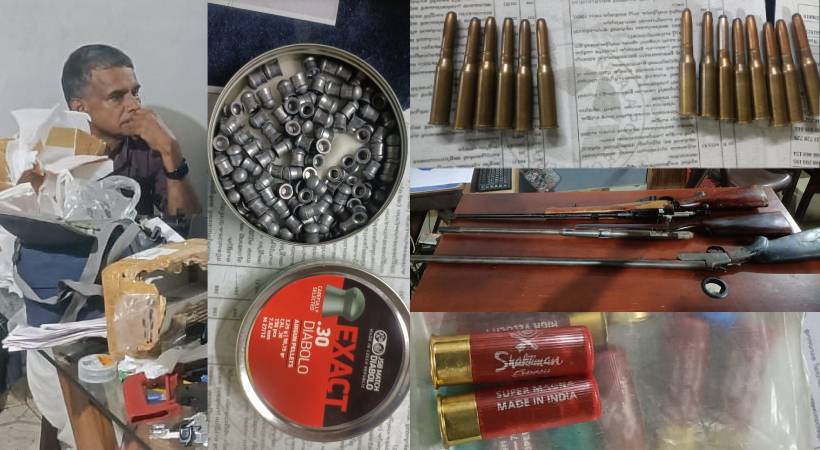 പൊലീസിന് ലഭിച്ച രഹസ്യ വിവരത്തിന്റെ അടിസ്ഥാനത്തിലാണ് വീട്ടിൽ പരിശോധന നടത്തിയത്. ഇത്രയധികം ആയുധങ്ങൾ സൂക്ഷിക്കുന്നതിനുള്ള ലൈസൻസ് ഉണ്ണിക്കമദിന് ഇല്ലായിരുന്നു. വീടിന്റെ മുകൾ ഭാഗത്ത് നടത്തിയ ആദ്യഘട്ട പരിശോധനയിൽ ഒരു റൈഫിളും 40 തിരകളും ഒരു ഗണ്ണും കണ്ടെത്തിയിരുന്നു. പിന്നാലെ വീടിന്റെ താഴെ ഭാഗത്ത് ഷട്ടറിട്ട ഭാഗത്ത് നടത്തിയ പരിശോധനയിലാണ് വൻ ആയുധ ശേഖരം കണ്ടെത്തിയത്.