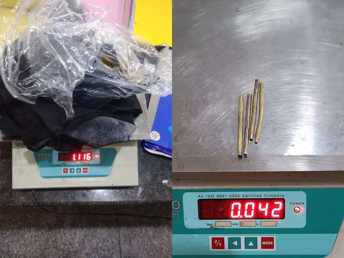 തുടർന്ന് നടത്തിയ പരിശോധനയിൽ ഏകദേശം രണ്ടു ലക്ഷം രൂപയോളം വിലമതിക്കുന്ന 42 ഗ്രാം തൂക്കമുള്ള നാലു സ്വർണറോഡുകളാണ് പിടിടിയത്. രണ്ടാമത്തെ കേസിൽ എയർ ഇൻഡ്യാ വിമാനത്തിൽ ദുബായിൽ നിന്നും എത്തിയ കാസറഗോഡ് കാഞ്ഞങ്ങാട് സ്വദേശിയായ ബേലികോത്ത് ഷാനവാസിൽ നിന്നുമാണ് സ്വർണം പിടികൂടിയത്. ഇയാളെ സംശയത്തിന്റെ അടിസ്ഥാനത്തിൽ കസ്റ്റംസ് ഉദ്യോഗസ്ഥർ നടത്തിയ പരിശോധനയിൽ ഷാനവാസ് ധരിച്ചിരുന്ന പാന്റ്സിനും അടിവസ്ത്രത്തിനും അസാമാന്യ ഭാരം തോന്നി. തുടർന്ന് നടത്തിയ വിശദ പരിശോധനയിലാണ് ഷാനവാസിന്റെ പാന്റ്സും അടിവസ്ത്രവും സ്വർണമിശ്രിതം തേച്ചുപിടിപ്പിച്ചവയാണെന്ന് കണ്ടെത്തിയത്.
