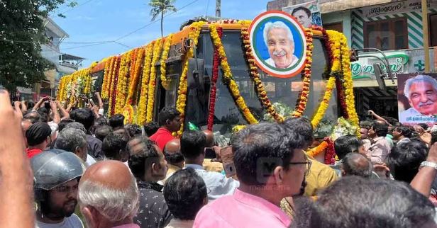 പിന്നിടുന്ന വഴിയോരങ്ങളില്‍ ആയിരങ്ങളാണ് അന്ത്യാഞ്ജലി അര്‍പ്പിക്കാനായി കാത്തുനില്‍ക്കുന്നത്. പ്രത്യേകം തയാറാക്കിയ കെഎസ്ആർടിസി ബസിലാണ് യാത്ര. വഴിയോരങ്ങളില്‍ കാത്തുനില്‍ക്കുന്ന ആബാലവൃദ്ധം ജനങ്ങള്‍ പെരുമഴ പോലും വകവയ്ക്കാതെ പൂക്കള്‍ അര്‍പ്പിച്ചും കൈകള്‍ കൂപ്പിയും സ്മരണാഞ്ജലികള്‍ അര്‍പ്പിച്ചു. വൈകിട്ടോടെ കോട്ടയം തിരുനക്കര മൈതാനത്ത് പൊതുദര്‍ശനം. തുടര്‍ന്ന് രാത്രിയോടെ പുതുപ്പള്ളിയിലെ കുടുംബവീട്ടിലേക്ക്. എംസി റോഡിൽ പുലർച്ചെ മുതൽ ഗതാഗത നിയന്ത്രണം ഏർപ്പെടുത്തി. സെന്റ് ജോർജ് ഓർത്തഡോക്സ് വലിയപള്ളിയിലെ പ്രത്യേക കബറിടത്തിൽ നാളെ 3.30ന് സംസ്കാരം. പരിശുദ്ധ ബസേലിയോസ് മാർത്തോമ്മാ മാത്യൂസ് തൃതീയൻ കാതോലിക്കാ ബാവാ മുഖ്യകാർമികത്വം വഹിക്കും.