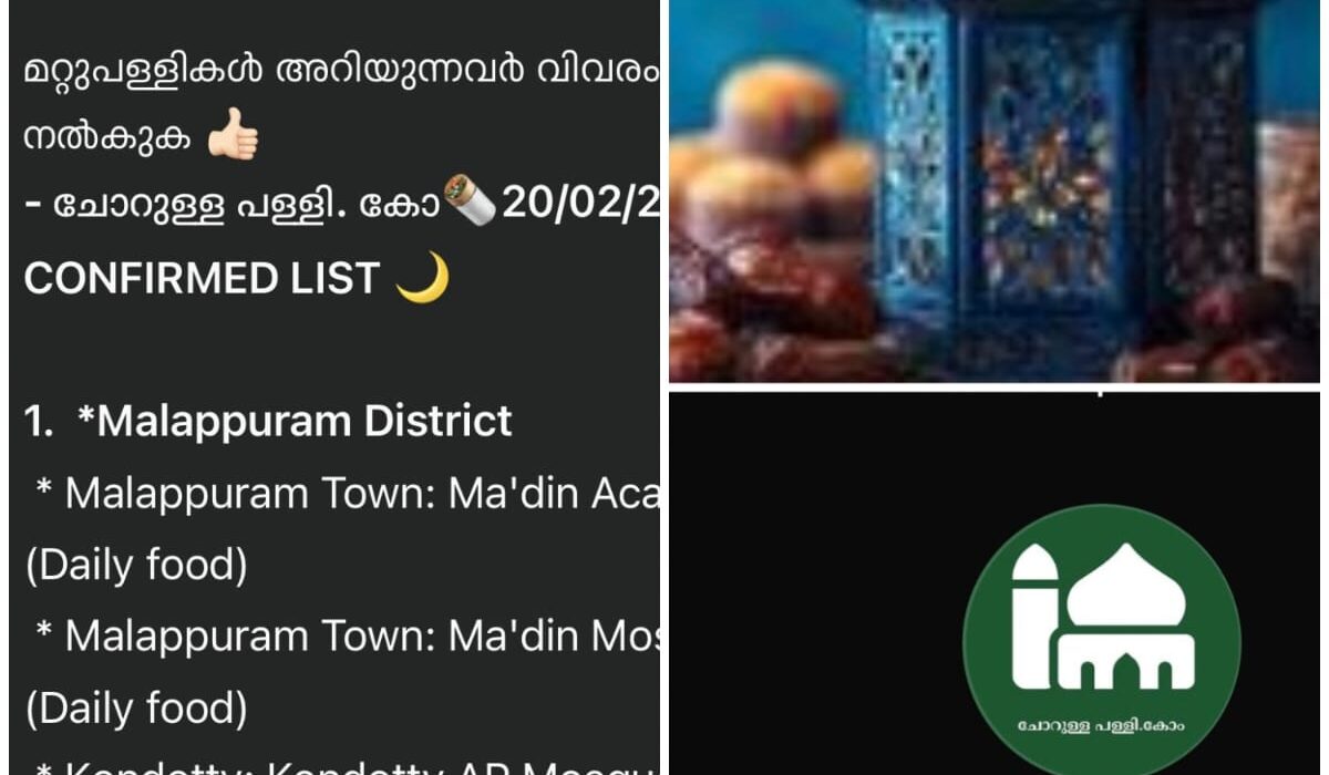 കോഴിക്കോട് ജില്ലയിൽ മാവൂർ റോഡിലെ മർകസ് ജുമാമസ്ജിദ്, നോളജ് സിറ്റിയിലെ പള്ളി തുടങ്ങിയ കേരളത്തിലെ തിരുവനന്തപുരം മുതൽ കാസർഗോഡ് വരെയുള്ളപള്ളികളി |ൽ നോമ്പുതുറയ്ക്ക് ഒരുക്കുന്ന വിഭവങ്ങൾ സംബന്ധിച്ച വിവരങ്ങൾ പരസ്പരം പങ്കിടുന്നു. അതുപോലെ കോഴിക്കോട്,തിരുവനന്തപുരം, മലപ്പുറം, കണ്ണൂർ, പാലക്കാട് ജില്ലകളിലെ വിവിധ പള്ളികളിലെ ഇഫ്താർ മെനുവും ബന്ധപ്പെട്ട ഗ്രൂപ്പുകളിൽ പങ്കുവെക്കപ്പെടുന്നു.