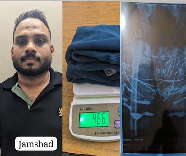 20.06.2023 ന് വൈകുന്നേര6 9 മണിക്ക് ദൂബായില്‍ നിന്നെത്തിയ സ്പൈസ് ജെറ്റ് (SG 54) വിമാനത്തിലാണ് ഇയാള്‍ കാലികറ്റ് എയര്‍പോര്‍ട്ടിലിറങ്ങിയത്. കസ്റ്റംസ് പരിശോധനയ്ക്ക് ശേഷം 8.20 മണിക്ക് വിമാനത്താവളത്തിന്‌ പുറത്തിറങ്ങിയ ജംഷാദിനെ, മലപ്പുറം ജില്ലാ പോലീസ് മേധാവി ശ്രീ.എസ്.സുജിത് ദാസ് ഐപിഎസിന് ലഭിച്ച രഹസ്യ വിവരത്തിന്റെ അടിസ്ഥാനത്തില്‍ പോലീസ് കസ്റ്റഡിയിലെടുക്കുകയായിരുന്നു.
