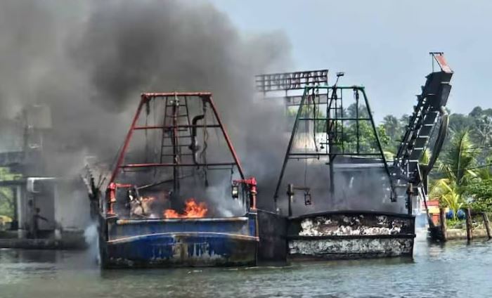 മത്സ്യബന്ധനം കഴിഞ്ഞ നാലു ബോട്ടുകളാണ് സെന്റ് ജോർജ് തുരുത്തിൽ തീരത്ത് കെട്ടിയിട്ടിരുന്നത്. ഇതരസംസ്ഥാനക്കാരായ ജീവനക്കാരാണ് ബോട്ടിലുണ്ടായിരുന്നത്. ഇവർ ഭക്ഷണം ഉണ്ടാക്കുന്നതിനിടെ പാചകവാതക സിലിണ്ടറിൽ നിന്നു തീപിടിക്കുകയായിരുന്നു.