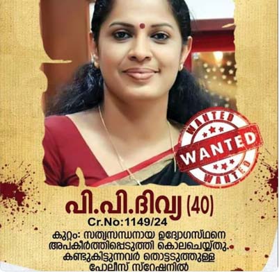 കണ്ണൂര്: എഡിഎം നവീന് ബാബു മരിച്ച സംഭവത്തില് കണ്ണൂര് മുന് ജില്ലാ പഞ്ചായത്ത് പ്രസിഡന്റ് പി പി ദിവ്യയെ കണ്ടെത്താന് സഹായിക്കുന്നവര്ക്ക് ഒരു ലക്ഷം രൂപ ഇനാം നല്കുമെന്ന് കോണ്ഗ്രസ്. യൂത്ത് കോണ്ഗ്രസ് പുറപ്പെടുവിച്ച ലുക്ക് ഔട്ട് നോട്ടീസ് പങ്കുവെച്ചുകൊണ്ടാണ് കോണ്ഗ്രസ് പാരിതോഷികം പ്രഖ്യാപിച്ചിരിക്കുന്നത്. കോണ്ഗ്രസ് കേരളയെന്ന എക്സ് പേജിലാണ് ലുക്ക് ഔട്ട് നോട്ടീസ് പങ്കുവെച്ചിട്ടുള്ളത്.