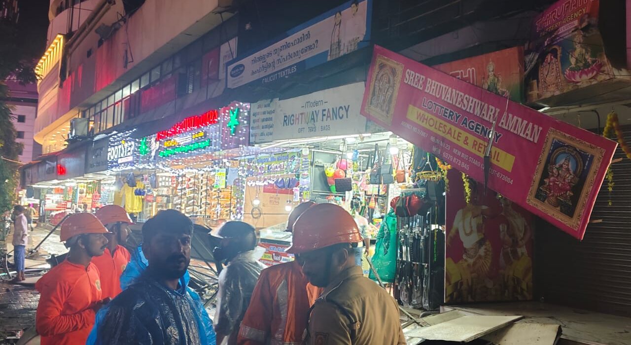 കോഴിക്കോട്: ഇന്ന് ഉണ്ടായ ശക്തിയായ മഴയിലും കാറ്റിലും കോഴിക്കോട് ബസ്റ്റാന്റിൽ മാസങ്ങൾക്ക് മുമ്പ് കത്തിയ കൊട്ടിടത്തിൻ്റെ ബോർഡും മറ്റും തകർന്ന് വീണ് അപകടം. കടക്കാരും, കാൽനടയാത്രക്കാരും രക്ഷപ്പെട്ടത് തലനാരിഴയ്ക്ക് . കോഴിക്കോട് ഫോക്കസ് മാളിന്റെ എതിർവശമുള്ള ശ്രീ ഭുവനേശ്വരി ലോട്ടറി ഏജൻസി അടക്കം പ്രവർത്തിക്കുന്ന കെട്ടിടത്തിൻ്റെ മുകൾ ഭാഗമാണ് ഭാഗികമായി ഇടിഞ്ഞു വീണ് വഴിയാത്രക്കാർക്ക് ബുദ്ധിമുട്ടുണ്ടാക്കിയത്.