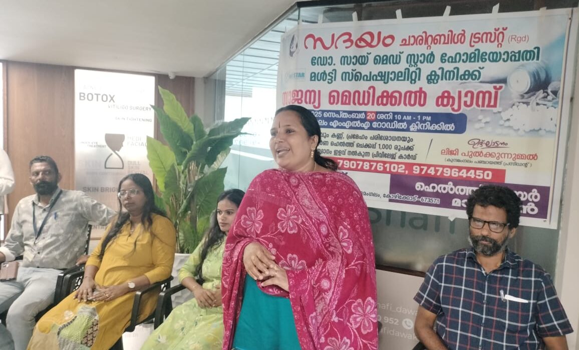 കുന്ദമംഗലം : സദയം ചാരിറ്റബിൾ ട്രസ്റ്റ് ഡോ. സായ് മെഡ് സ്റ്റാർ ഹോമിയോപ്പതി മൾട്ടി സ്പെഷ്യാലിറ്റി ക്ലിനിക്കുമായി ചേർന്ന് സൗജന്യ ഹോമിയോ മെഡിക്കൽ ക്യാമ്പ് നടത്തി. ഗ്രാമപഞ്ചായത്ത് പ്രസിഡണ്ട് ലിജി പുൽക്കുന്നുമ്മൽ ഉദ്ഘാടനം ചെയ്തു. ട്രസ്റ്റ് ചെയർമാൻ എം.കെ. രമേഷ് കുമാർ അധ്യക്ഷത വഹിച്ചു.