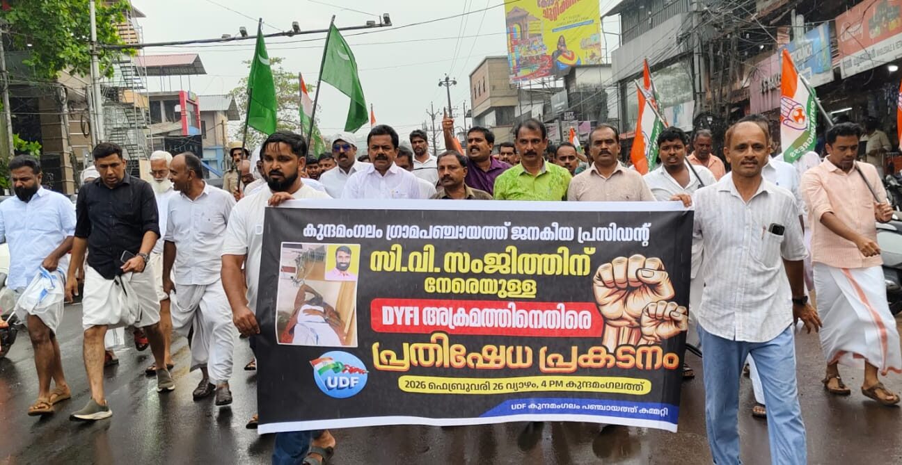 കുന്ദമംഗലം ബസ് സ്റ്റാൻഡിൽ സംഘടിപ്പിച്ച പ്രതിഷേധ പ്രകടനം എൻ സുബ്രഹ്മണ്യൻ ഉദ്ഘാടനം നടത്തി . പഞ്ചായത്ത് യു.ഡി.എഫ് ചെയർമാൻ എ. പി അശോകൻ അധ്യക്ഷനായി. ബുധനാഴ്ച രാത്രി കുന്ദമംഗലം പഞ്ചായത്ത് പ്രസിഡന്റ് സി.വി. സംജിത്തിന് ഡി.വൈ.എഫ്.ഐ പ്രവർത്തകരുടെ മർദ്ദനമേറ്റ തന്നെ തുടർന്നാണ് പ്രകടനം സംഘടിപ്പിച്ചത്.