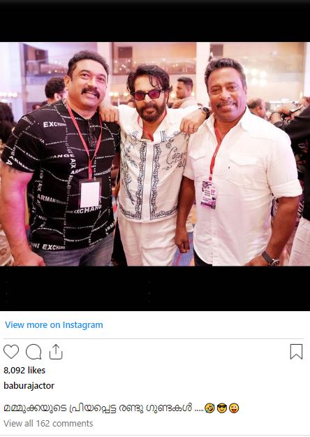 ഓരോ തവണ അമ്മ സംഘടനയുടെ വാർഷിക പൊതുയോഗം കഴിയുമ്പോഴും സമൂഹമാധ്യമങ്ങളിൽ നിറയുന്ന ചിത്രങ്ങളിൽ മലയാളികളുടെ അഭിമാനതാരമായ മമ്മൂട്ടിയും മോഹൻലാലും നിറഞ്ഞുനിൽക്കുക പതിവാണ്. എന്നാൽ ഇത്തവണത്തെ നടനും സംവിധായകനുമായ ബാബുരാജ് ഷെയർ ചെയ്ത ചിത്രങ്ങളാണ് ഇപ്പോൾ ശ്രദ്ധ നേടുന്നത്. അബു സലിമിനും ബാബുരാജിനുമൊപ്പം പോസ് ചെയ്യുന്ന മമ്മൂട്ടിയെ ആണ് ചിത്രത്തിൽ കാണാനാവുക. ‘മമ്മുക്കയുടെ പ്രിയപ്പെട്ട രണ്ടു ഗുണ്ടകൾ’ എന്നാണ് ബാബുരാജ് ചിത്രത്തിനു ക്യാപ്ഷൻ നൽകിയിരിക്കുന്നത്.