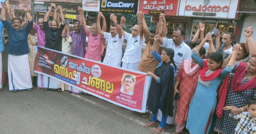 കുന്നമംഗലം;’ പൊരുതുക ലഹരിക്കെതിരെ , ഒന്നിക്കുക നാടിനു വേണ്ടി ‘ എന്ന മുദ്രാവാക്യമുയർത്തി സിപിഐ എം കുന്നമംഗലം ഏരിയാ കമ്മിറ്റി നേതൃത്വത്തിൽ ജനകീയ മനുഷ്യചങ്ങല സംഘടിപ്പിച്ചു. സ്ത്രീകൾ, കുട്ടികൾ, അധ്യാപകർ, വ്യാപാരികൾ, കച്ചവടക്കാർ തുടങ്ങി നാടിൻ്റെ വിവിധ തുറയിൽപ്പെട്ടവർ ചങ്ങലയിൽ കണ്ണികളായി. ദേശീയപാതയിൽ സംഘടിപ്പിച്ച മനുഷ്യച്ചങ്ങല മനുഷ്യമതിലായി രൂപപ്പെട്ടു. നാടിനെ കാർന്നുതിന്നുന്ന ലഹരിയെന്ന വിപത്തിനെതിരെ പ്രതിരോധിക്കുമെന്ന് പങ്കെടുത്തവർ പ്രതിഞ്ജയെടുത്തു. ജനകീയ മനുഷ്യചങ്ങല സിപിഐ എം ജില്ലാ സെക്രട്ടറി എം മെഹബൂബ് ഉദ്ഘാടനം ചെയ്തു. ജില്ലാ കമ്മിറ്റി അംഗം പി കെ പ്രേമനാഥ് അധ്യക്ഷനായി. പി ടി എ റഹീം എംഎൽഎ സംസാരിച്ചു. ജില്ലാ കമ്മിറ്റി അംഗം പി ഷൈപു സ്വാഗതം പറഞ്ഞു.