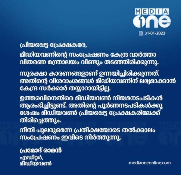 മീഡിയ വണ് ചാനലിന്റെ സംപ്രേക്ഷണത്തിന് കേന്ദ്ര വാര്ത്താ വിനിമയ മന്ത്രാലയം വീണ്ടും വിലക്കേർപ്പെടുത്തി. സുരക്ഷാ കാരണങ്ങള് ഉന്നയിച്ചാണ് കേന്ദ്രം ചാനലിന്റെ സംപ്രേക്ഷണം തടഞ്ഞതെന്ന് മീഡിയ വണ് എഡിറ്റര് ഇന് ചീഫ് പ്രമോദ് രാമന് ഔദ്യോഗിക പേജിലൂടെ അറിയിച്ചു. ഉത്തരവിനെതിര മീഡിയ വണ് നിയമനടപടികള് ആരംഭിച്ചിട്ടുണ്ടെന്നും പ്രമോദ് രാമന് വിശദീകരിച്ചു.